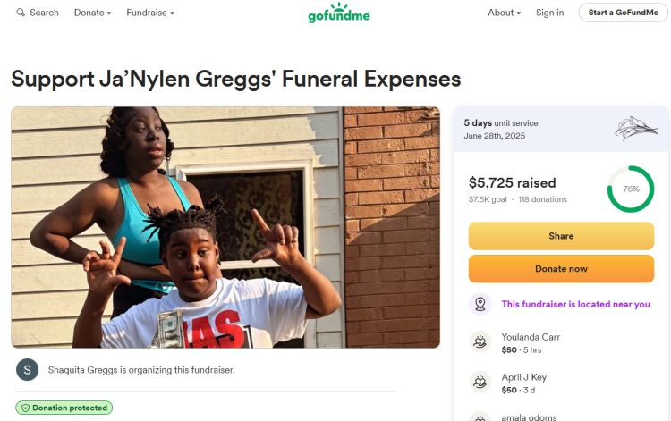 자날린 그렉스 군의 장례비용 모금을 위한 고펀드미 페이지.