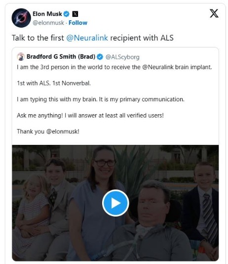 게시물에 따르면 스미스는 지금까지 뉴럴링크 칩 이식수술을 받은 3번째 사지마비 환자이며, ALS 환자로는 첫 사례다.