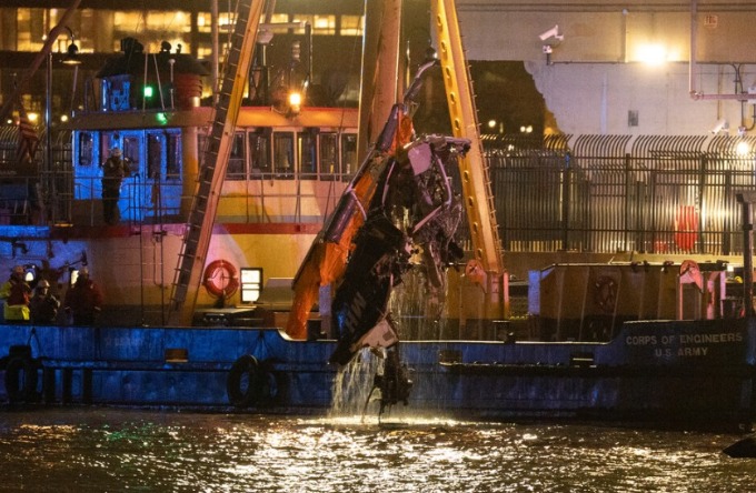 11일 구조 당국이 전날 허드슨강 헬기 추락 사고에서 추락한 헬기 잔해를 끌어내고 있다. UPI연합뉴스