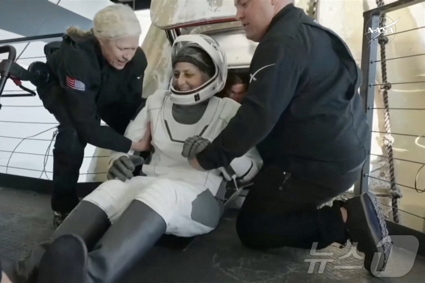 18일(현지시간) 9개월 간 국제우주정거장(ISS) 생활을 마치고 귀환한 우주비행사 수니 윌리엄스가 스페이스X의 유인우주선 '크루 드래건'