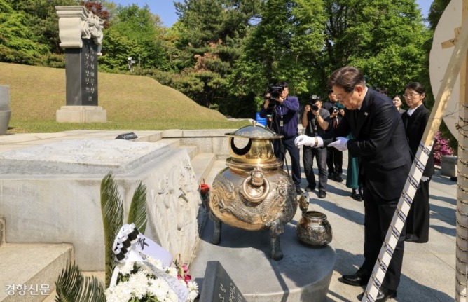 “망인들 평가는 역사에…” 이재명 더불어민주당 대선 후보가 28일 서울 동작구 국립서울현충원에서 박정희 전 대통령 묘소에 분향하고 있다. 이준헌 기자