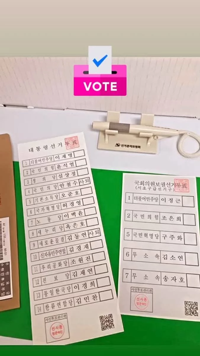 사진에는 기표소 내로 추측되는 공간에서 투표용지를 촬영한 모습이 담겼다. 상단에는 ‘VOTE’(투표)라고 적힌 이모티콘을 첨부, 투표 참여를 독려하는 듯 보인다.