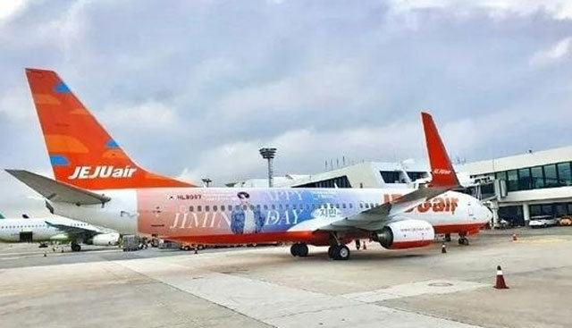 방탄소년단(BTS) 멤버 지민의 사진과 생일 축하 문구로 장식된 제주항공 비행기. 사진 출처 관차저왕