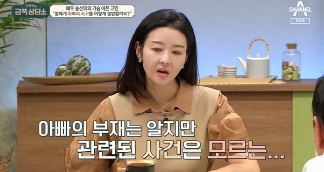송선미는 “아빠에게 일어난 사건을 어떻게 표현해줘야 할지 모르겠다”며 “아빠와 혈연관계에 있던 사람이 물질적인 욕심 때문에 다른 사람을 시켜 아빠한테 이걸 했다고 했을 때 아직 어린 딸이 사람에 대한 긍정적인 반응이 아닌 부정적인 마음을 가져야 할까, 또는 우리 가족이 그런 일을 했다는 것을 어디까지 어떻게 표현해줘야 할지 모르겠다”고 심경을 전했다.