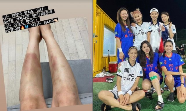 안혜경, 멍투성이 다리 공개 “나는 아무렇지도 않다” DMVmoa 0 1065 2021.09.01 22:13 2일 안혜경은 인스타그램 스토리에 멍이 든 다리 사진을 공개하며 “나는 괜찮다, 아무렇지도 않다. 승리를 가져다준 멍이기 때문에 나는아프지 않다! FC불나방 우리는 하나”라고 적었다.안혜경은 현재 SBS ‘골때리는 그녀들’에 출연하며 매주 축구 연습과 경기를 치르고 있다. 축구 훈련으로 인한 멍투성이 다리에 많은 이들이 위로와 응원의 반응을 보이고 있다. 한편 지난 1일 방송된 ‘골때리는 그녀들’에서 안혜경이 소속된 FC불나방은 박선영의 쐐기골로 구척장신팀을 제치고 결승에 진출했다.(서울=뉴스1)