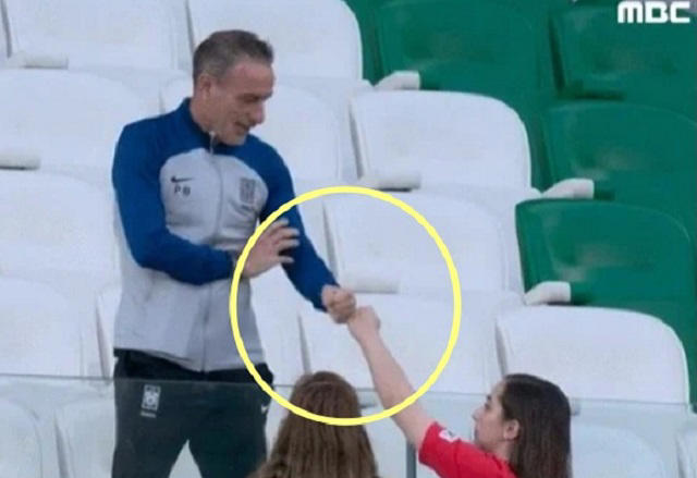 벤치가 아닌 관중석에서 경기를 지켜봐야 했던 지난 포르투갈전 당시 파울루 벤투 감독이 경기 전 반갑게 ‘주먹 인사’를 나눴던 외국인 여성의 정체가 밝혀졌다.