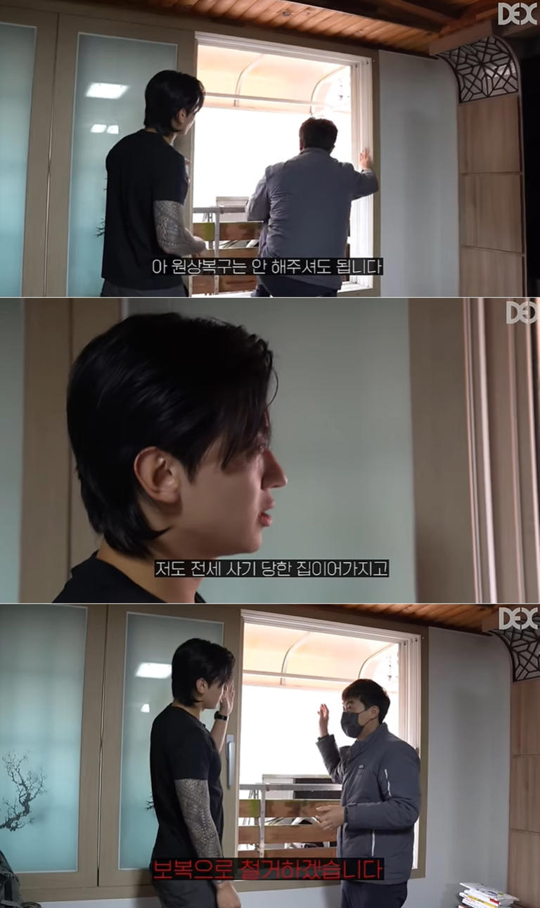 덱스는 "그럼 떼고나서 원상 복구는 안 해주셔도 된다"라며 답했다. 이에 설치 기사는 "다시 사용하는 거 아니냐"며 묻자, 덱스는 "전세 사기당한 집이어서 잘 모르겠다. 이 집은 사실 집주인이 없다. 보복으로 철거하겠다. 유일하게 할 수 있는 보복이 비받이 제거인 것 같다"고 기뻐했다.