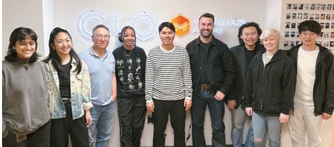 지난 23일 아카데미 과학기술상을 수상한 오승우 클로버추얼패션 대표가 컬버시티 사무실에서 직원들과 함께 활짝 웃고 있다. 김상진 기자