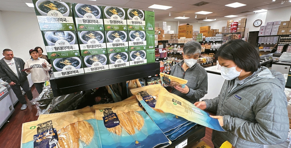 LA한인타운 감자바우에서 고객들이 황태 제품을 살펴보고 있다. 김상진 기자