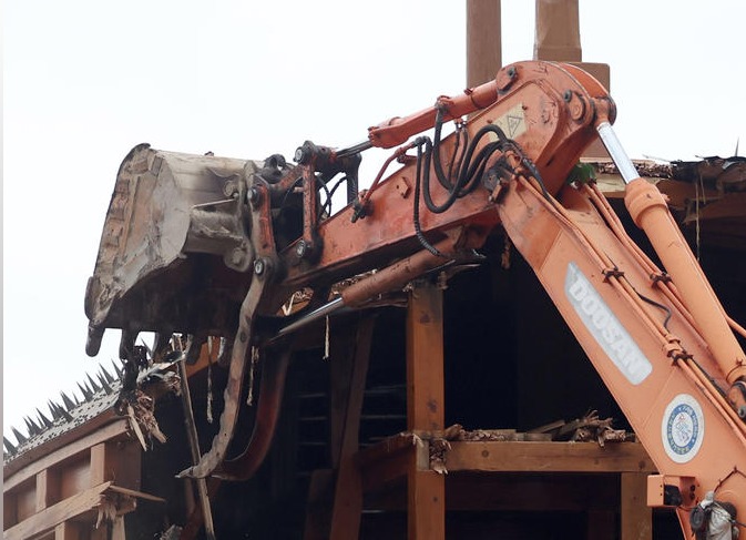 11일 오전 경남 거제시 거제 해양문화관 내 위치한 거북선이 철거되고 있다. 연합뉴스 © 연합뉴스