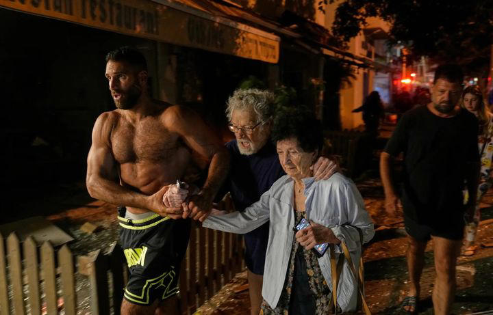 이스라엘 텔아비브 폭격 현장에서 30대 남성이 노부부를 구해 감동을 주고 있다.