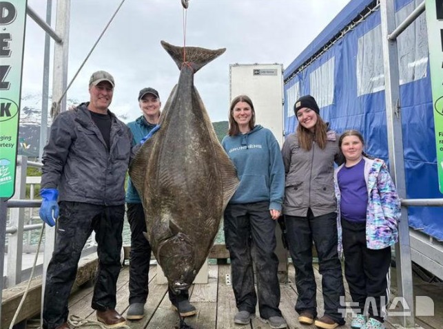 [뉴시스] 일링워스 부부가 자신들이 낚은 71kg에 달하는 대광어 옆에서 웃으며 사진을 찍고 있다. (사진=알래스카뉴스소스) 2025.06.17. © 뉴시스