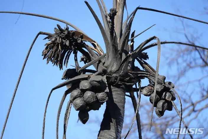 [라하이나=AP/뉴시스] 코코넛 나무 한 그루가 산불로 시커멓게 그을려 있다. 2023.08.13. *기사 본문과는 무관한 사진 © 뉴시스