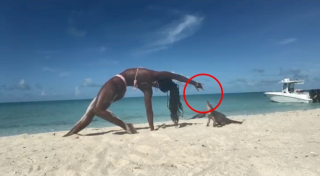 지난 21일 트위터에 올라온 영상에 따르면 핑크색 비키니를 입은 한 여성이 손과 발을 반대쪽으로 쭉 뻗는 요가 자세를 취하고 있다. 손을 머리 위로 곧게 뻗은 찰나 해변 위 이구아나 한 마리가 여성에게 접근하더니 가볍게 점프해 여성의 왼손을 물어뜯었다.