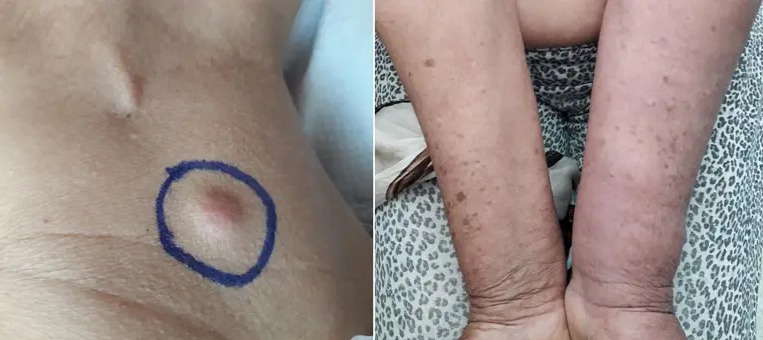 튀니스의대가 공개한 위장관암의 피부 전이 8명 환자 사례 중 2명 증상을 소개한다. 63세 여성 A씨의 경우 몸통과 목에 여러 결절이 생겼고