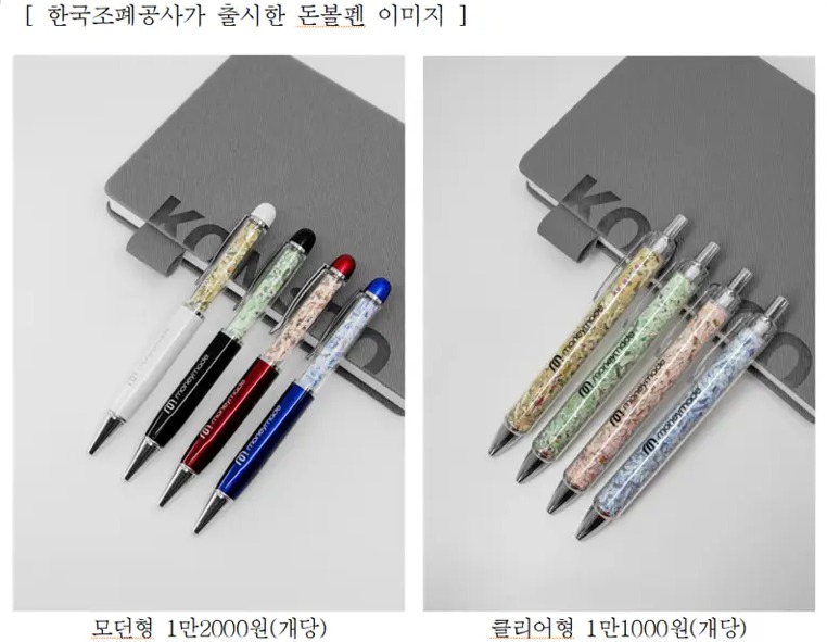 지난달 기업 판매를 시작한 데 이어, 이번에는 일반 소비자를 대상으로 ‘돈볼펜’ 3종을 출시한다. 모던형, 클리어형, 미니볼형으로 구성되며, 각 볼펜에는 조폐공사의 화폐 부산물 굿즈 브랜드명(BI)인 ‘머니 메이드