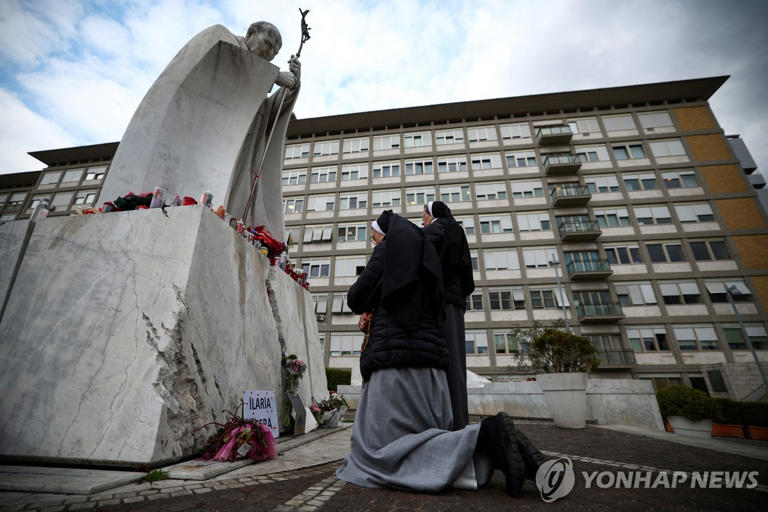 프란치스코 교황이 입원한 이탈리아 로마 제멜리 병원 앞에서 교황의 쾌유를 기도하는 수녀들