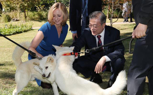 당시 문재인 대통령이 2018년 10월 12일 오전 청와대에서 가진 영국의 공영방송 BBC와 인터뷰에서 로라 비커 진행자에게 평양에서 열린 남북정상회담에서 김정은 북한 국무위원장에게 선물 받은 풍산개 곰이와 송강이를 소개하고 있다. 청와대 제공