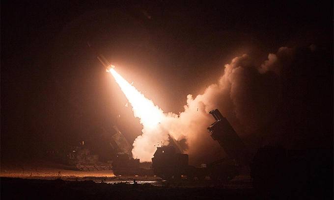 북한이 지난 6월 5일 단거리 탄도 미사일 8발을 쏘는 도발을 하자 한미 연합군이 지난 6월 6일 지대지 미사일 8발을 시험 발사했다. 합동참모본부는 지난 6월 6일 오전 "한미 동맹은 오늘 4시45분경부터 북한의 다수의 탄도 미사일(SRBM) 도발에 대한 대응으로 연합 지대지미사일 ATACMS(에이태킴스) 8발을 동해상으로 사격했다"고 밝혔다. 8발 중 한국군이 7발, 미군이 1발을 발사했다. 사진은 한미 에이태킴스 지대지 미사일 발사 장면. 합동참모본부 제공  © 제공: 세계일보