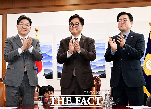 원내대표가 20일 오전 서울 여의도 국회에서 열린 여야 원내대표회동에 참석해 연금개혁 합의문 발표를 마친 뒤 박수를 치고 있는 모습./배정한 기자