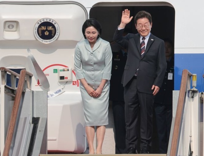 주요 7개국(G7) 정상회의에 참석하는 이재명 대통령이 김혜경 여사와 16일 성남 서울공항 공군 1호기에서 출국하기 전 인사하고 있다. ⓒ연합뉴스