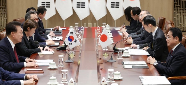 윤석열 대통령이 26일 서울 용산 대통령실에서 기시다 후미오 일본 총리와 한일 정상회담을 하고 있다. 대통령실통신사진기자단