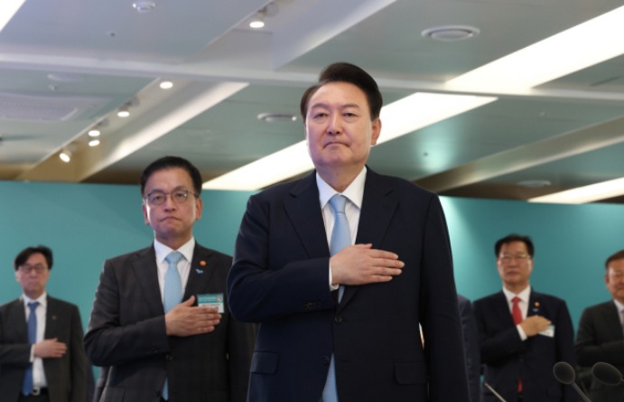 윤석열 대통령이 17일 세종특별자치시 정부세종청사에서 열린 2024년 국가재정전략회의에서 국기에 경례하고 있다. 연합뉴스