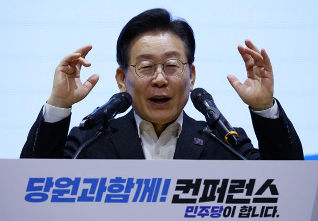 이재명 더불어민주당 대표가 19일 대전 유성구 대전컨벤션센터에서 열린 '당원과 함께-민주당이 합니다' 충청편 행사에서 발언하고 있다. 대전=뉴시스