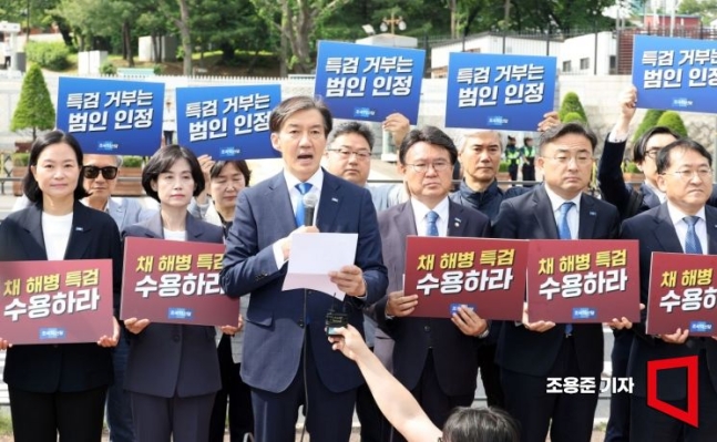 조국 조국혁신당 대표, 황운하 원내대표 등 당선인들이 20일 서울 용산구 대통령실앞에서 채 해병 특검 수용을 촉구하는 기자회견을 하고 있다. 사진=조용준 기자