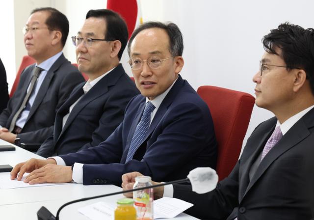 추경호(오른쪽 두 번째) 국민의힘 원내대표가 22일 서울 여의도 국회에서 중진의원 간담회를 주재하고 있다. 뉴스1