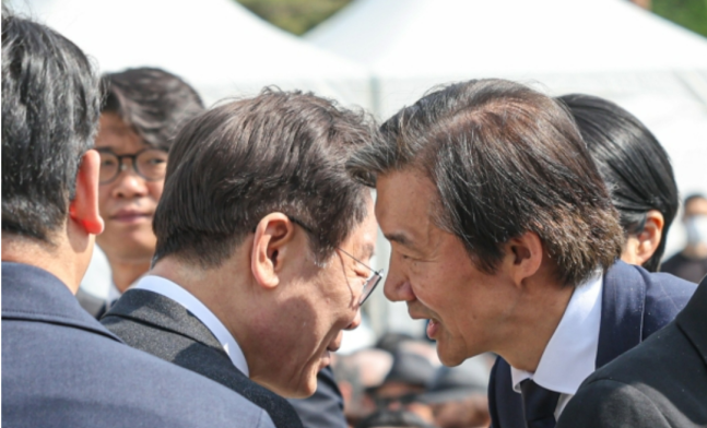 이재명 더불어민주당 대표와 조국 조국혁신당 대표가 19일 오전 서울 강북구 국립4.19민주묘지에서 거행된 제64주년 4.19혁명 기념식에서 인사하고 있다. 뉴스1 |