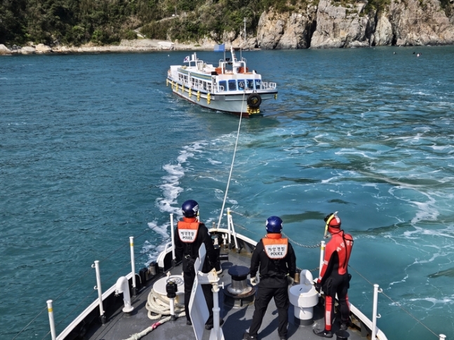 10일 해경이 경남 통영시 오곡도 인근 해상에서 표류 선박을 예인하고 있다. 통영해양경찰서 제공