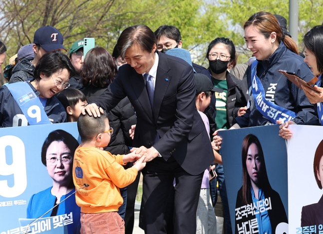 조국 조국혁신당 대표가 7일 오전 서울 영등포구 여의도한강공원 이벤트광장에서 지지자들에게 인사를 하고 있다. 뉴시스
