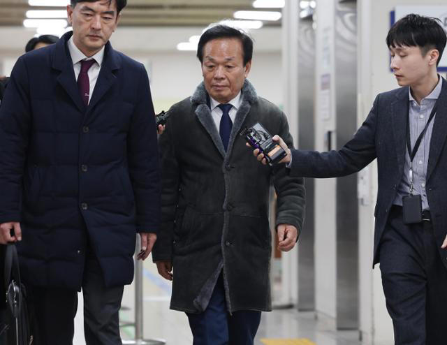 ‘백현동 개발사업 비리 의혹’ 관련 핵심 로비스트로 지목된 김인섭(가운데) 전 한국하우징기술 대표가 13일 오후 서울 서초구 서울중앙지법에서 열린 특정범죄가중처벌법상 알선수재 혐의 선고 공판에 출석하고 있다. 뉴시스