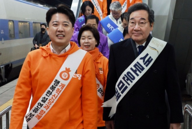 새로운미래 이낙연 공동대표와 개혁신당 이준석 대표가 9일 오전 서울 용산역에서 설 귀성인사를 하기 위해 이동하는 모습. 연합뉴스