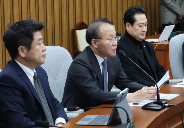 윤재옥(가운데) 국민의힘 원내대표가 26일 국회에서 열린 원내대책회의에서 발언하고 있다. 연합뉴스