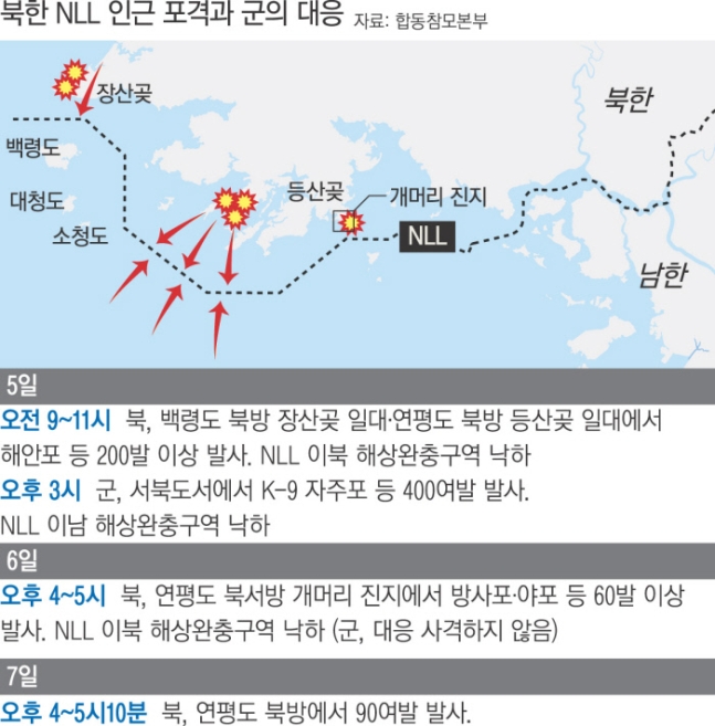 7일 합동참모본부에 따르면 북한은 지난 5일부터 이날까지 사흘 연속으로 서해 접경지 일대에서 포병 사격을 실시했다. 이날 오후 4시경부터 오후 5시10분까지 연평도 북방에서 90발 이상의 포 사격을 진행했다. 포탄은 서해 북방한계선(NLL) 이북 해상에 떨어졌다. 전날에도 오후 4시경부터 한 시간 동안 연평도 북서방 개머리 진지에서 방사포와 야포 등 총 60발 이상을 발사했다. 역시 포탄은 NLL 이북 해상완충구역에 낙하했다. 이보다 앞선 지난 5일 북한은 백령도 북방 장산곶 일대와 연평도 북방 등산곶 일대에서 해안포 등 200여발을 쐈다. 당시 군은 두 배에 이르는 포 사격으로 맞대응했다. 연평도에는 북한 사격과 대응 사격 시 한 차례씩 주민 대피령이 내려졌다.