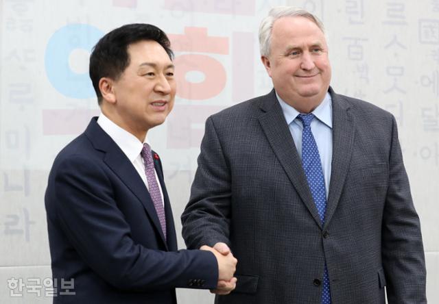 김기현(왼) 국민의힘 대표와 인요한 혁신위원장이 6일 국회 국민의힘 당대표시에서 만나 악수하고 있다. 고영권 기자