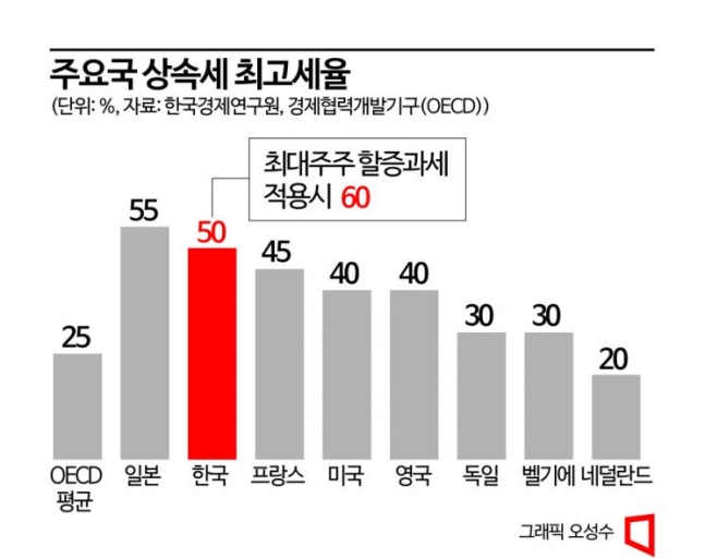 현행 한국의 직계 비속에 대한 상속세 최고세율은 50%로 최대주주 할증까지 합산할 경우 60%에 달한다. 이는 경제협력개발기구(OECD) 평균(약 25%)의 2배 수준으로 상속세가 가장 높은 국가에 속한다. 현재 OECD 38개국 중 상속세가 있는 국가는 24개국, 없는 국가는 14개국이다. 주요국 상속세율은 일본이 55%로 가장 높고, 프랑스 45%, 미국 40%, 영국 40%, 독일 30% 등이다. 호주·캐나다·스웨덴 등은 상속세 대신 상속받은 재산을 향후 처분하는 시점에 발생하는 차익에 대해 세금을 매기는 자본이득세를 운영 중이다.