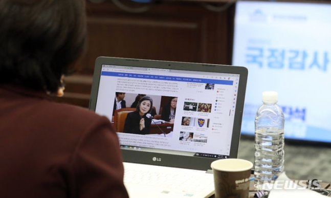 국정감사에서 한 여당 위원이 김행 여성가족부 장관 후보자의 기사를 보고 있다. 2023.10.10.