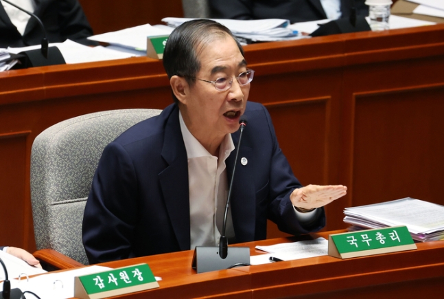 한덕수 국무총리가 31일 국회에서 열린 예산결산특별위원회 전체회의에서 더불어민주당 기동민 의원의 질의에 답하고 있다. 연합뉴스