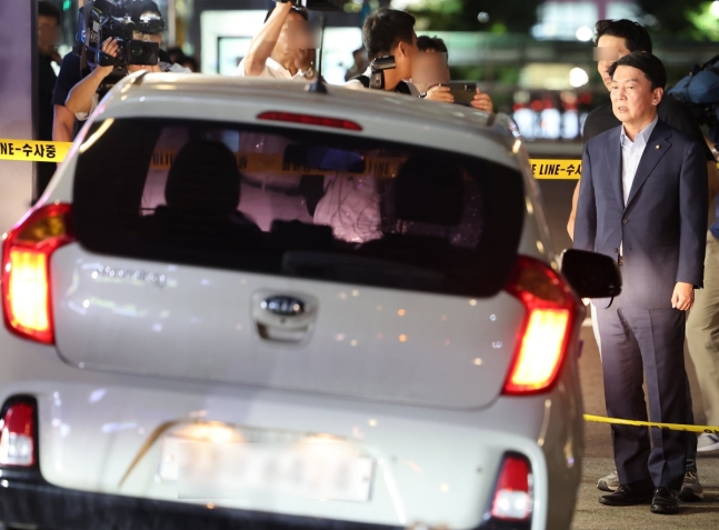 안철수 국민의힘 의원이 3일 오후 경기 성남시 분당구 서현역 인근 묻지마 흉기 난동 사건 현장을 찾아 용의자가 인도로 돌진해